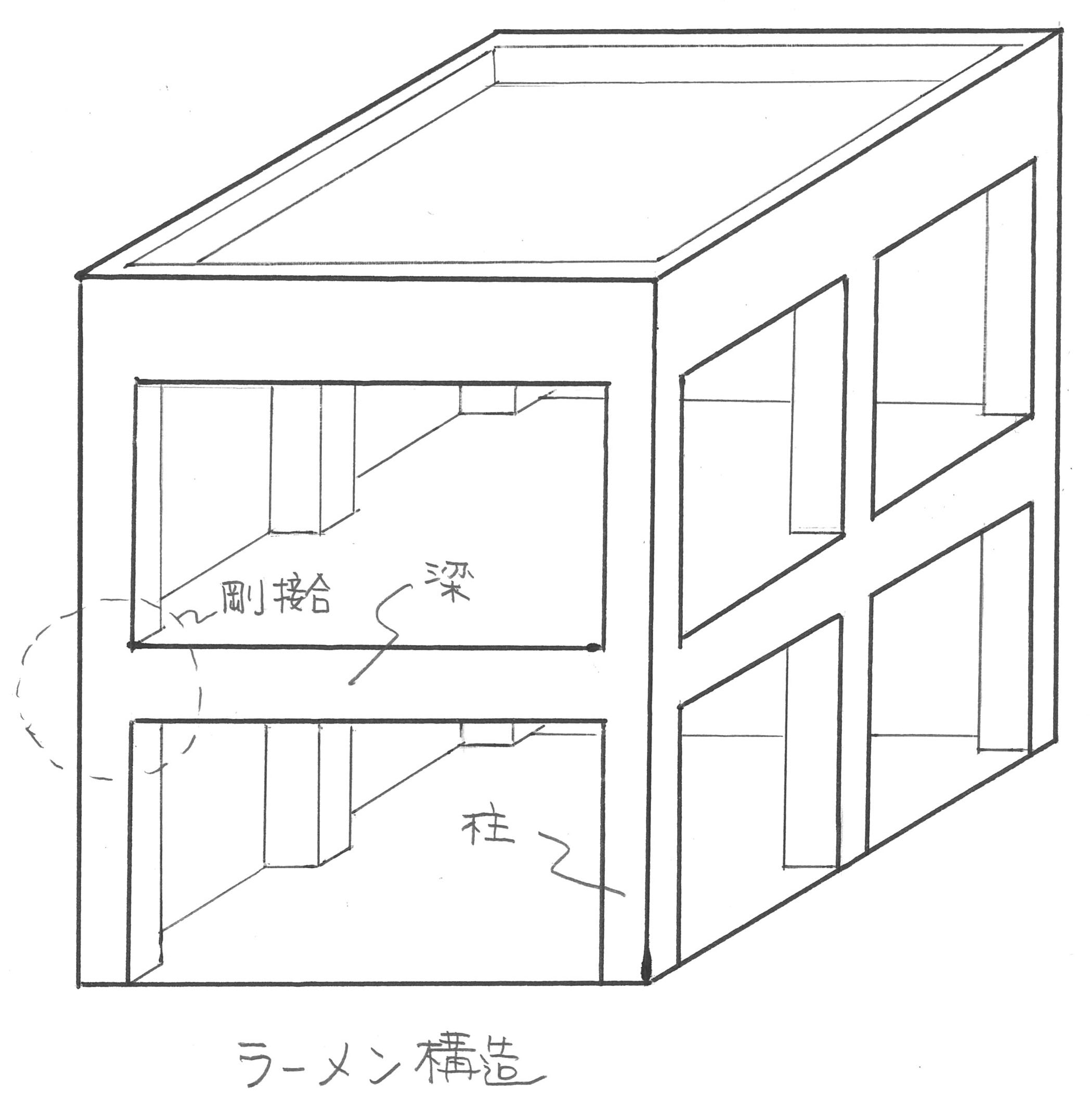 ラーメン(Rahmen)とは、ドイツ語で「額縁・フレーム」という意味で、このことから柱と梁の接合部を剛接合した構造のことを指します。(剛接合とは、部材同士の接合方法のひとつであり、柱と梁を一体化するように頑丈に接合する方法のことを指します。「剛」とは、接合部の角度が固定され、回転しない状態のことを意味します。)