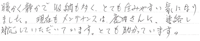 「この歳になってから建て直すなんて、、、」と当初話されていましたが、何度か冬を越した後、「暖かくてすごくいい。建てて良かった。」としみじみ話されたとき、設計者として嬉しさを感じました。今後も益々健康で長生きしていただきたいと思います。