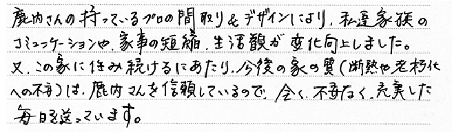 奥様とは新築計画以前からのお付き合いでしたので、価値観を一緒にできたのがスムーズに建築計画を進められた要因でしょうね。現在から将来に向けた生活スタイルに応えるために、試行錯誤した記憶がよみがえってきました。 これからも長いお付き合いになると思いますのでよろしくお願いします。 p.s.今度はご主人様からゴルフを教えていただきたいですね。