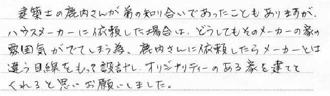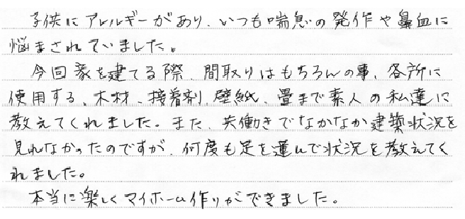 お子様のアレルギーを考慮し、使用する材料を一緒に吟味し、実際にテストまでして完成までこぎつけましたね。結果的に家族皆様が健康で快適に住まわれていることに安心しました。 完成後おじゃました際、いつも「素敵な家です!」と言葉をかけてくださるので設計者として満足感を味わっています。